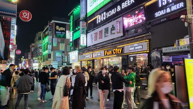 사회적 거리두기가 전면 해제된 2022년 4월 18일 서울 광진구 건대입구역 인근 거리의 모습. 뉴스1