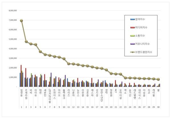 가수 브랜드평판 1위를 기록한 임영웅 브랜드는 참여지수 1,470,345 미디어지수 2,302,364 소통지수 1,682,026 커뮤니티지수 1,504,075가 되면서 브랜드평판지수 6,958,810으로 분석됐다. 지난 2월 브랜드평판지수 5,054,444과 비교해보면 37.68% 상승했다.