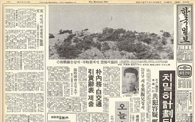 매일매일, 시시각각 한국일보 플랫폼은 경쟁매체보다 빠르고 깊은 뉴스와 정보를 생산하고 있다. 이 과정에서 1954년 창간 이래 역사의 물줄기를 바꾸거나 국민적 감동을 이끌어낸 수많은 특종이 발굴됐다. 지난 70년 다수의 특종과 사건 중 파장이 컸던 내용들을 연도별로 안배해 ‘70대 특종’을 골라내 뉴스 이용자들에게 소개한다.휴전선 눈앞에서 선회해 불시착을 준비 중인 대한항공 여객기 사진을 게재한 1971년 1월 26일 자 1면. |