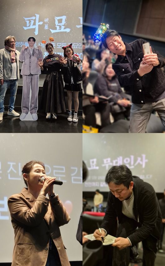 당시 무대인사에는 장재현 감독을 비롯해 최민식, 김고은, 유해진, 김재철, 김병오, 김지안, 김태준, 정윤하, 김선영 씨까지 '파묘' 무대인사 중 최다 인원이 참여해 그 의미를 더했다. 배우들은 무대인사 동안 직접 관객의 휴대전화를 들고 사진을 찍어주거나 친필 사인을 해주는 등 다채로운 팬서비스를 통해 객석을 가득 채운 관객들에게 특별한 하루를 선사했다.