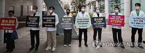 (진주=연합뉴스) 박정헌 기자 = 경상국립대학교 의대 교수 및 학생들이 25일 오후 경남 진주시 경상국립대 암센터 앞에서 의대 정원 증원 철회를 요구하는 집회를 하고 있다. 2024.3.35