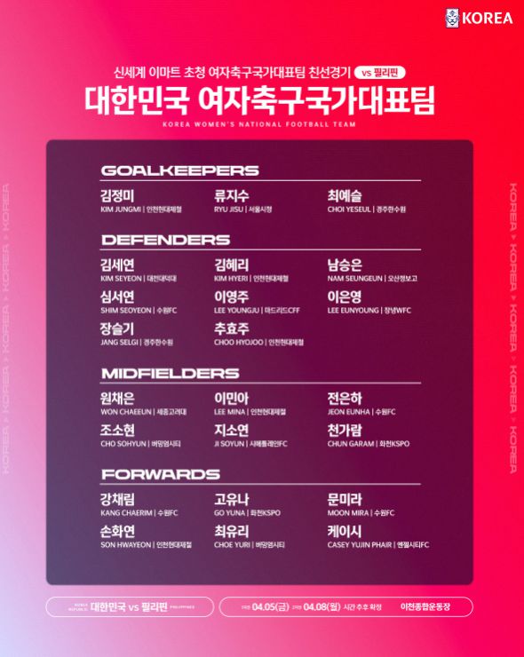신세계 이마트 초청 여자축구국가대표팀 친선경기 필리핀 2연전에 출전하는 콜린 벨호는 25일 명단을 공개했다.
