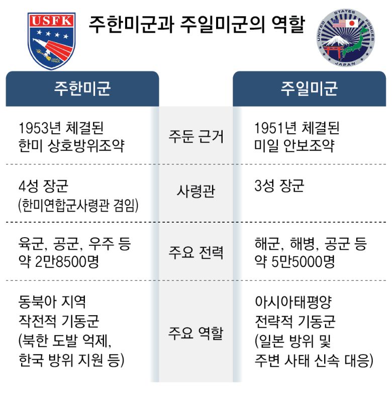 정부 소식통은 “미일 양국은 다음 달 정상회담을 기점으로 주일미군의 역내 대응력을 획기적으로 향상시킬 수 있는 방안을 집중 논의할 것으로 보인다”고 밝혔다. 양욱 아산정책연구원 연구위원도 “대북 방어 목적의 지상군 중심인 주한미군과 달리 미일 동맹 아래 주일미군은 상대적으로 운용 폭이 자유롭다”면서 “중국의 대만 침공 가능성 등에 대비해 주일미군을 미 인태 전략의 핵심 전력으로 활용하겠다는 것”이라고 분석했다.