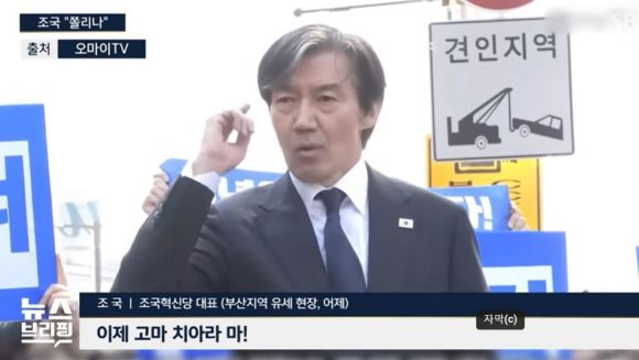SBS ‘편상욱의 뉴스브리핑’ 보도 장면. 조국 조국혁신당 대표가 지난 21일 부산을 찾아 시민들을 만나 윤석열 정권을 향한 경고성 발언으로 “이제 고마 치아라 마”라고 외치고 있다. 유튜브 채널 ‘SBS 뉴스’ 캡처 |