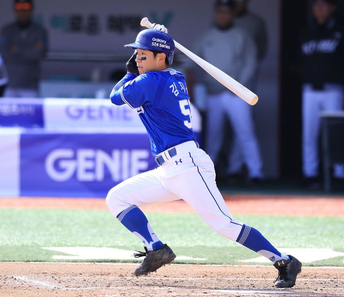 삼성 리드오프 김지찬이 24일 KT와 경기에서 안타를 치고 있다. 사진 | 삼성 라이온즈 |