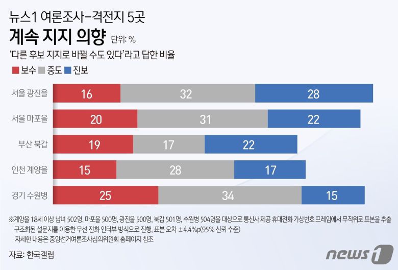 구체적으로 '계속 지지 의향'을 묻는 질문에 '다른 후보 지지로 바뀔 수도 있다'라고 답한 비율이 △마포을(보수 20%―중도 31%―진보 22%) △수원병(보수 25%―중도 34%―진보 15%) △계양을(보수 15%―중도 28%―진보 17%) △광진을(보수 16%―중도 32%―진보 28%)이었다.