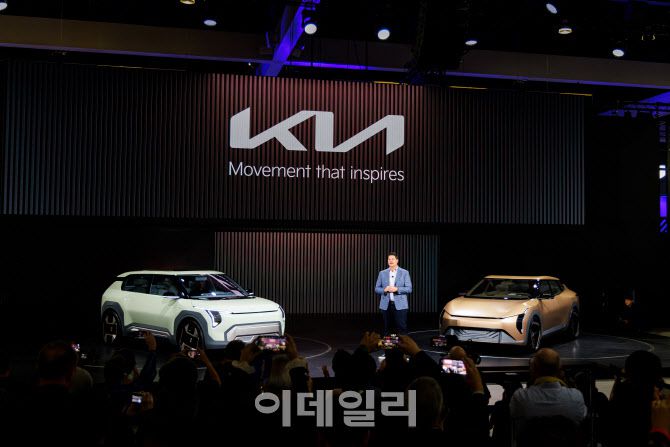 기아 미국 판매법인 판매사업 부사장 에릭 왓슨이 지난해 11월 미국 LA컨벤션 센터에서 열린 ‘2023 LA오토쇼’에서 콘셉트카 EV3와 EV4를 발표하고 있다.(사진=기아) |