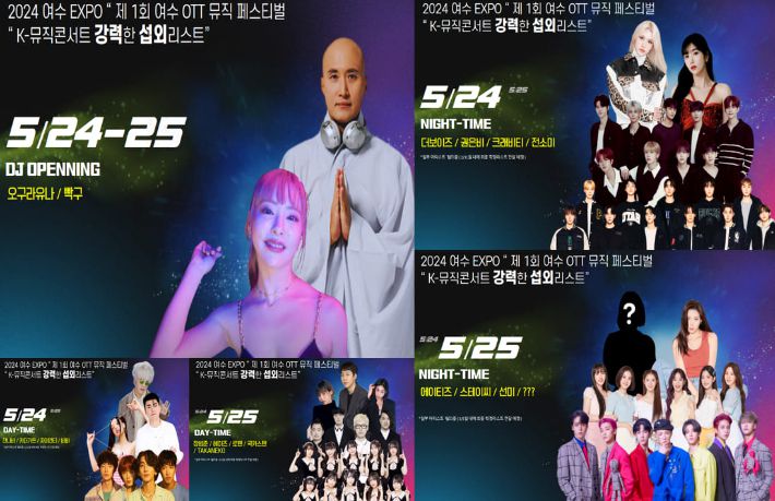 '여수엑스포 OTT뮤직페스티벌'은 오는 5월 24~25일 여수엑스포 스카이타워전망대 해안가 일대에서 열린다. K-콘텐츠 인플루언서, K팝 아이돌그룹, 콘텐츠 체험, 아티스트 팬미팅 및 팬사인회 등 OTT 관련 콘텐츠를 한곳에서 만날 수 있다.