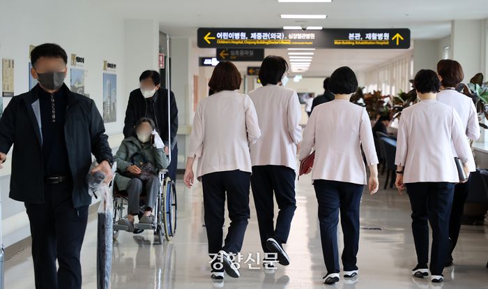 전국 의대 교수 집단 사직서 제출 이틀 차인 지난 26일 서울 시내 한 대학 병원에서 간호사들이 환자를 돌보기 위해 이동하고 있다. 조태형 기자