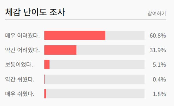 "매우 어려웠다" 60.5%, "약간 어려웠다" 32.1%, "보통이었다" 5.1%, "약간 쉬웠다" 0.6%, "매우 쉬웠다" 1.8%