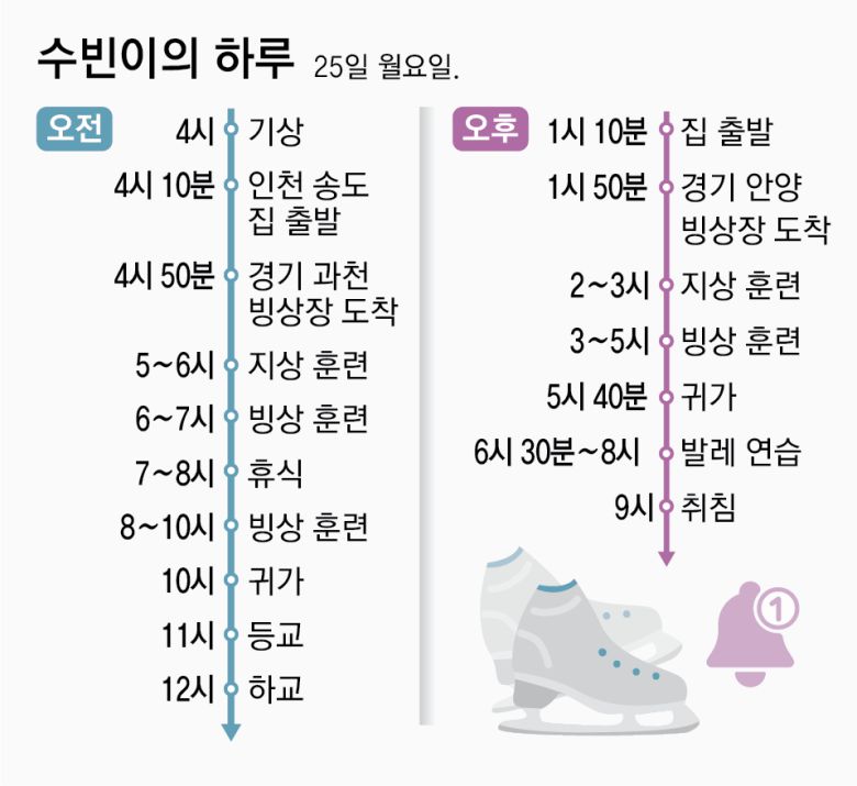빙상장에서 오전 10시까지 훈련한 수빈이는 다시 40km를 달려 인천 집에 도착한 뒤 학교에서 수업을 들었다. 그러고는 또 30km를 이동해 오후 2시부터 경기 안양종합운동장 실내빙상장에서 훈련했다. 이어 오후 6시 반부터 8시까지 발레 교습을 받았다. 16시간 만에 이날 일정을 모두 마무리한 것이다. 그런데도 수빈이의 어머니 홍은숙 씨(42)는 “월요일은 그나마 동선도 짧고 일정도 일찍 끝나는 여유로운 날”이라고 했다.