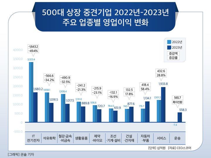 업종별로는 IT전기전자 업종의 영업이익이 절반 가까이 줄어드는 등 전체 13개 업종 가운데 8개 업종의 영업이익이?감소했다. IT전기전자 업종의 지난해 영업이익은 1조6802억원으로 2022년 3조3234억원 대비 49.4%(1조6432억원) 줄었다.