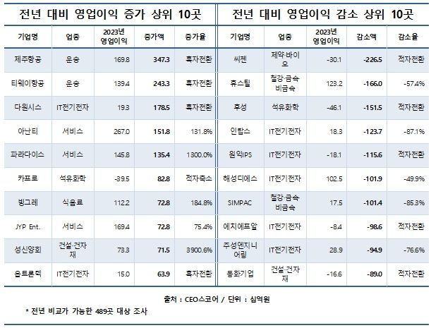 특히 제주항공은 지난해 1698억원의 영업이익으로 전년(-1775억원) 대비 흑자 전환했다. 2022년 1039억원의 적자를 기록했던 티웨이항공도 지난해 1394억원을 거두며 흑자를 달성했다.?다원시스의?경우?지난해?193억원의?영업이익을?기록하며?전년(-1593억원)?대비?흑자 전환했다.