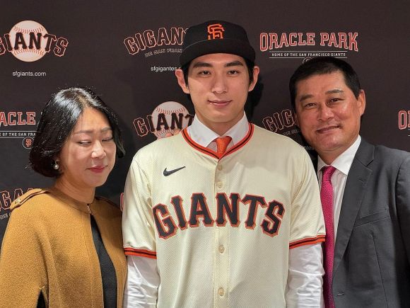 ‘바람의 아들’ 이종범이(오른쪽 첫 번째) 15일(현지시간) 미 캘리포니아주 샌프란시스코 오라클파크에서 열린 이정후의 샌프란시스코 자이언츠 입단식에서 이정후와 아내 정연희씨와 함께 기념 촬영을 하고 있다. 2023.12.16 연합뉴스 |