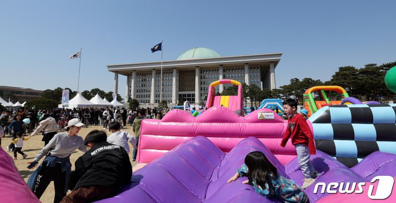 (서울=뉴스1) 박지혜 기자 = 31일 서울 여의도 국회의사당에서 열린 '2024 국회개방행사'를 찾은 어린이와 시민들이 즐거운 시간을 보내고 있다. 이번 행사에서는 여의도 봄꽃 축제기간 국회를 방문하는 시민들에게 편히 쉬면서 즐길 수 있는 다양한 프로그램을 제공하기 위해 마련됐다. 2024.3.31/뉴스1