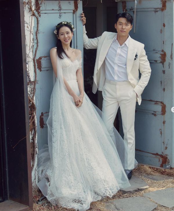 사진 속 손예진은 빈티지한 건물을 배경으로 화이트 수트 차림의 현빈과 포즈를 잡고 있다. 쇄골 라인이 그대로 드러난 드레스 차림의 손예진의 청순함이 인상적이다.