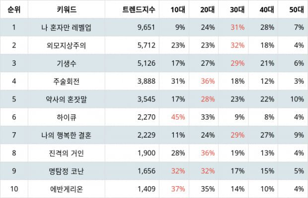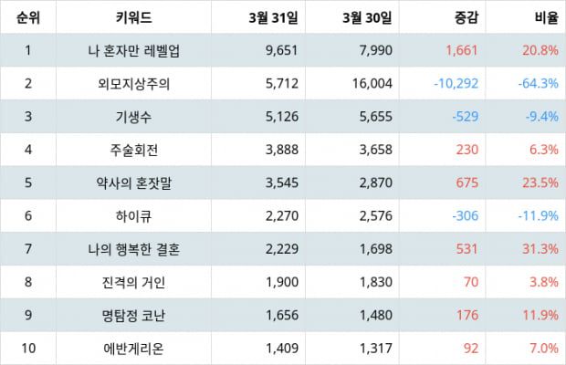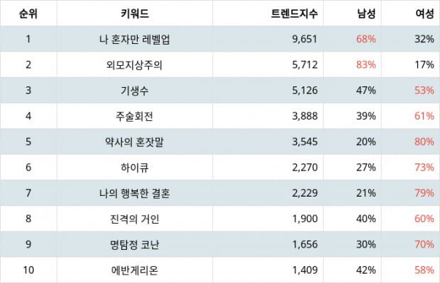 트렌드 지수 1위 나 혼자만 레벨업의 빅데이터 조사한 결과, 나 혼자만 레벨업 애니, 나 혼자만 레벨업 몇부작, 나 혼자만 레벨업 게임, 나 혼자만 레벨업 웹툰, 나 혼자만 레벨업 넷플릭스 등이 주목받는 관련 검색어로 나타났으며 2위 외모지상주의는 외모지상주의 나무위키, 외모지상주의 천량, 외모지상주의 이벌구, 외모지상주의 굿즈, 외모지상주의 진무진, 3위 기생수는 기생수 더그레이, 기생수 영화, 기생수 애니, 기생수 파트2, 기생수 미기 등으로 나타났다.
