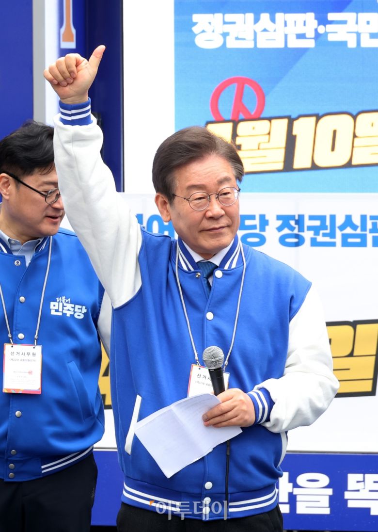 이재명 더불어민주당 상임공동선거대책위원장이 28일 서울 용산역 광장에서 열린 정권심판・국민승리 선거대책위원회 출정식에서 포즈를 취하고 있다. 고이란 기자 photoeran@