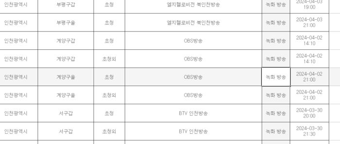 중앙선거방송토론위원회가 지난달 27일 홈페이지에 게시한 ‘제22대 지역구 국회의원선거 후보자토론회 개최 예정 현황’ 자료 중 일부. 중앙선거방송토론위원회 홈페이지 갈무리.