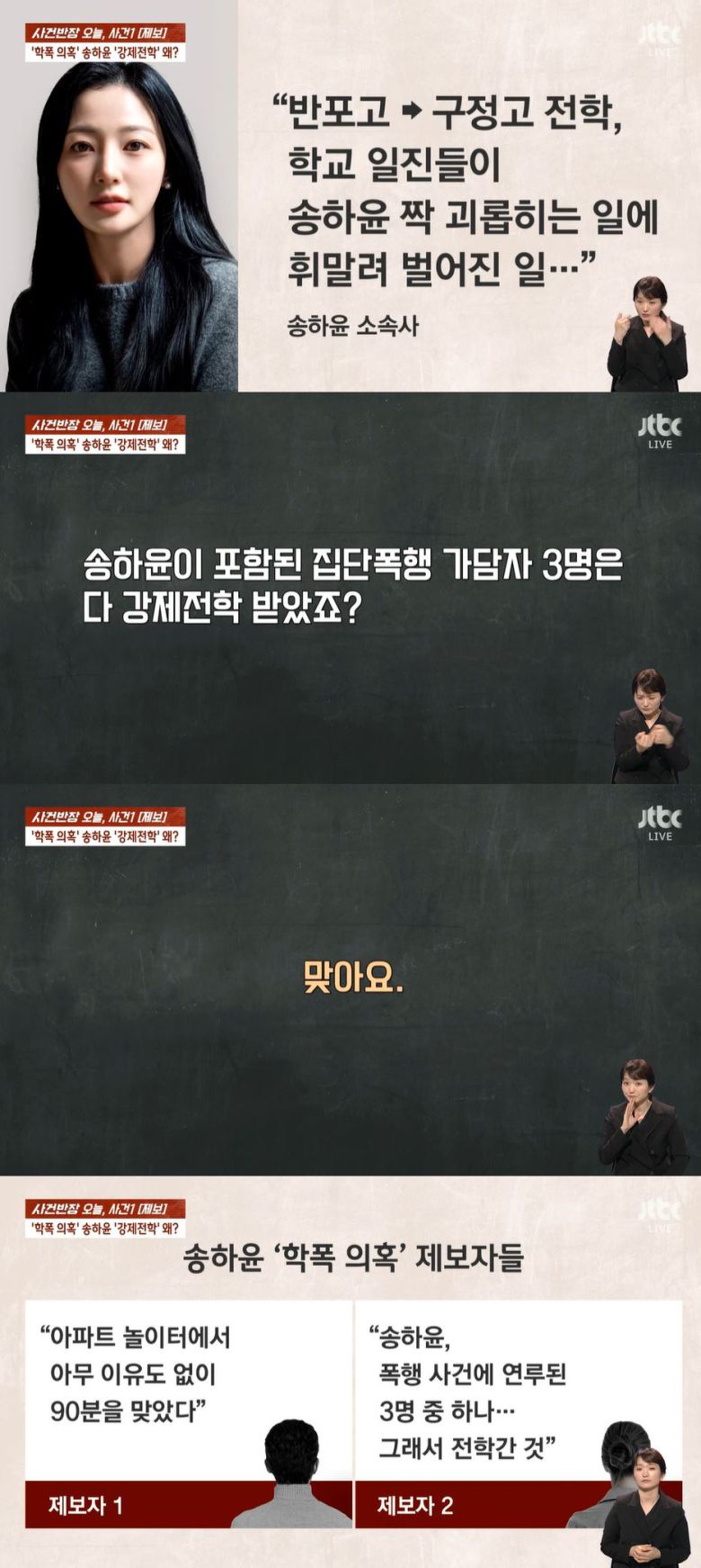 이후 제보자는 송하윤이 자신과는 별개로 다른 학교 폭력 사건으로 인해 강제 전학을 갔다고 주장했다.