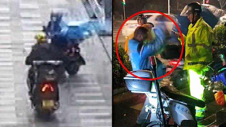 현지 시각 2일 중국 상하이에서 배달업체 라이더가 헬멧으로 자기 머리를 여러 차례 내리칩니다.