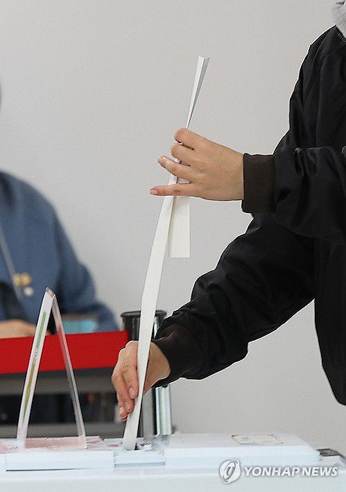 (대구=연합뉴스) 윤관식 기자 = 제22대 국회의원선거 사전투표가 시작된 5일 오전 대구 달성군 유가읍 행정복지센터에 마련된 사전투표소에서 한 유권자가 비례대표투표용지를 세로로 접어 투표함에 넣고 있다. 2024.4.5