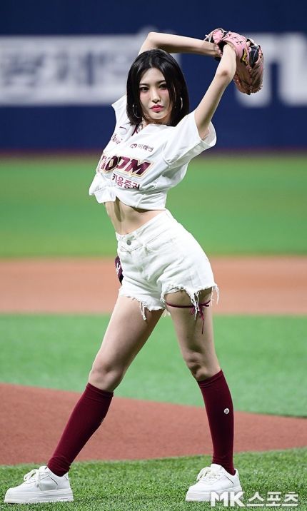 주인공은 과감히 소매를 걷어붙인 크롭탑에 레트로 무드의 데님 쇼츠를 매치한 엑신 멤버 니즈가 피치를 던지는 듯한 포즈로 관객들의 시선을 한몸에 받았다.