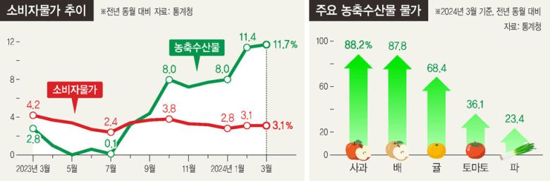 통계청의 ‘소비자물가동향’을 보니, 지난달 소비자물가지수는 113.94(2020년=100)로 지난해 같은 달보다 3.1% 올랐다. 지난해 8월부터 3%대로 오른 물가 상승률은 올해 1월 2.8%로 떨어졌으나 2~3월 연속으로 3%대를 이어갔다. 물가를 들썩이게 한 건 과일이었다. 사과는 지난해 같은 달에 견줘 88.2% 올라 2월(71%)보다 오름폭이 더 커졌다. 통계 작성이 시작된 1980년 1월 이후 최대 상승 폭이다. 배도 87.8% 올라 조사가 시작된 1975년 1월 이후 최대 상승률을 기록했다. 귤(68.4%) 등도 크게 뛰면서 과실물가지수는 40.3% 올랐다.