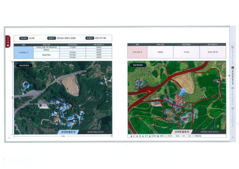 전남도가 국토지리정보원에서 촬영 제작한 항공사진과 1000분의 1 수치지형도 및 5000분의 1 국가기본도를 공급받아 최신 공간정보를 무상 개방한다고 6일 밝혔다. 사진은 지난 2021년 발생한 광양 산사태 관련 공간정보서비스 제공 사례. 전남도 제공 |