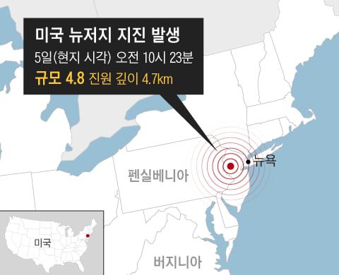 5일(현지 시각) 미국 뉴욕시에서 서쪽으로 60여㎞ 떨어진 곳에서 규모 4.8 지진이 발생했다. 인명 피해나 심각한 건물 파손 등의 피해는 보고되지 않았지만, 뉴저지주 일부 지역에서는 건물 손상으로 주민이 대피하는 소동이 벌어졌다. 뉴욕시 당국은 지진 발생 후 40분이나 지나 재난알림문자를 보내면서 늦장 대응으로 따가운 비판을 받았다.