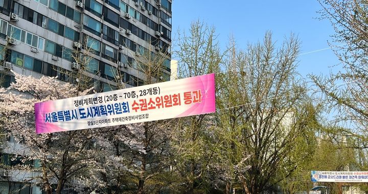 7일 잠실 주공 5단지 아파트 정문에는 '서울특별시 도시계획위원회 수권소위원회 통과' 사실을 알리는 주택재건축정비사업조합의 플래카드가 크게 걸렸다. 그 뒤에도 '성원에 감사드리며 빠른 재건축 이뤄내겠습니다'라는 플래카드가 하나 더 걸렸다.