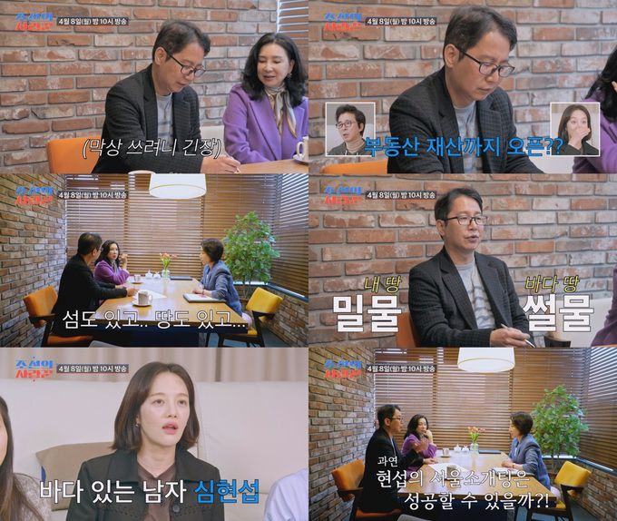 상담사는 심현섭에게 “부동산 재산은 어느 정도인지 대략적으로 작성해달라”고 부탁했고, 이를 지켜보던 황보라는 “너무 디테일하다”며 깜짝 놀랐다. 심현섭이 생각에 빠지자 심혜진은 “제가 봤을 때는 최하 OO억 정도 된다. 섬도 있고 땅도 있으니까”라고 전해 궁금증을 자아냈다.