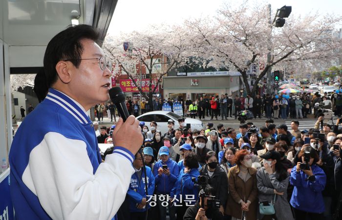 이재명 더불어민주당 대표가 4월 4일 울산 남구에서 박성진 후보 지지유세를 하고 있다. 박민규 선임기자 |