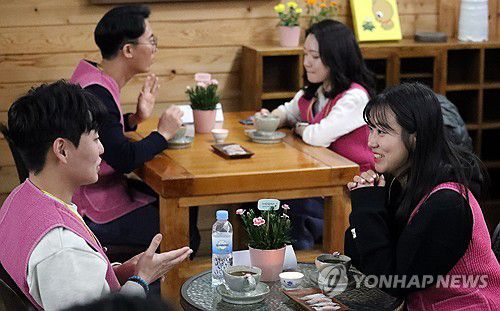 (인천=연합뉴스) 이세원 기자 = 대한불교조계종 사회복지재단이 30대 미혼 남녀 20명을 대상으로 6일 인천 강화군 소재 전등사에서 실시한 1박2일 일정의 템플스테이 '나는 절로'에서 남녀 참가자가 찻잔을 사이에 두고 대화를 하고 있다. 2024.4.7