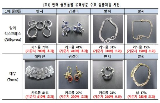 카드뮴 검출량이 안전 기준치를 초과한 장신구는 총 90점이었고, 납 검출량이 기준치를 초과한 장신구는 8점(중복 포함)으로 조사됐다. 알리익스프레스를 통해 들여온 4142원짜리 반지에서는 안전 기준치를 무려 700배 초과한 카드뮴(70%)이 검출됐고, 테무에서 산 1307원짜리 발찌에서는 기준치를 283배 초과하는 납(17%)이 검출됐다. 알리익스프레스에서 구매한 1803원짜리 귀걸이에서는 카드뮴과 납이 각각 17.44%, 1.98% 검출됐다. 테무를 통해 수입된 787원짜리 귀걸이의 카드뮴과 납 검출량은 15.95%, 3.14%에 달했다. 카드뮴과 납 검출량의 안전 기준치는 각각 0.1% 미만, 0.06% 미만이다.