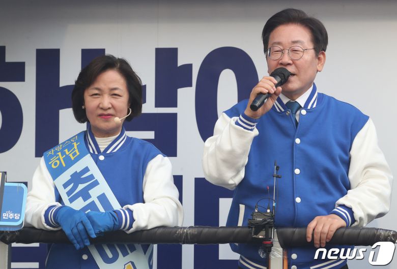 이재명 더불어민주당 대표가 7일 오후 경기도 하남시 스타필드시티위례 앞에서 추미애 경기 하남갑 후보의 지지를 호소하고 있다./뉴스1 ⓒ News1 임세영 기자 |