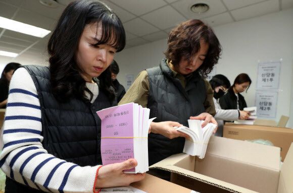 제22대 국회의원 선거를 앞둔 8일 오전 서울 중구 선거관리위원회 사무실에서 각 동의 투표관리관들이 투표 관련 교육을 받은 후 해당 투표구에서 사용될 투표용지를 직접 검수하고 있다. 연합뉴스 |