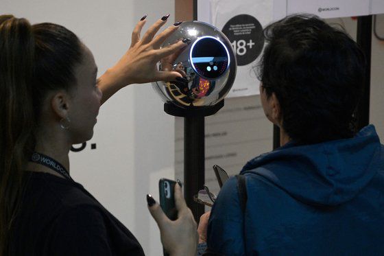 월드코인은 생체인식 장치 ‘오브(Orb)’를 통해 홍채를 스캔하는 방식으로 신원을 인증하는 서비스를 제공한다. 등록 이용자에게는 월드코인 암호화폐를 보상으로 지급한다. 지난달 22일 아르헨티나 부에노스아이레스에서 한 고객이 홍채를 스캔하고 있다. 연간 물가상승률이 270%까지 치솟자 수십만 명의 아르헨티나인들이 홍채 등록에 나서고 있다. [연합뉴스]