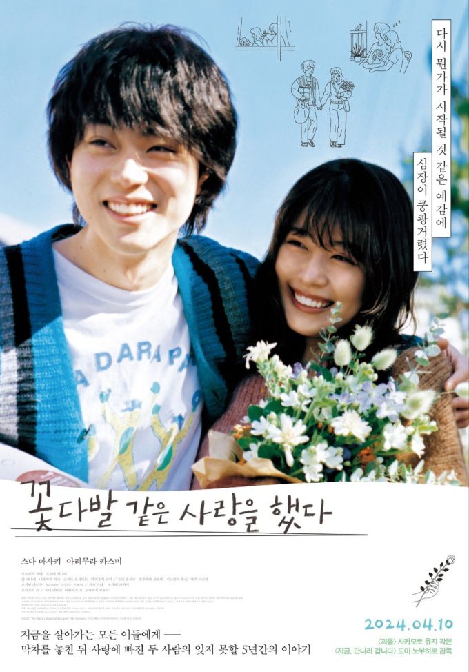 영화 '꽃다발 같은 사랑을 했다'는 막차를 놓친 후 우연히 만나 급속도로 사랑에 빠진 대학생 '무기'와 '키누'의 5년 동안연애를 그린 현실 공감 로맨스 영화다. 2021년 국내 개봉 당시에도 일본의 인기 최정상 만능 엔터테이너 '스다 마사키'와국민 여배우 '아리무라 카스미' 만남으로 화제를 모았다.