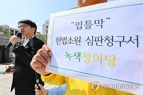 (서울=연합뉴스) 신현우 기자 = 녹색정의당 신민기 대전시당 대변인이 9일 오전 서울 종로구 헌법재판소에 한국과학기술원(KAIST) 학위 수여식에서 대통령경호처 요원에게 강제로 퇴장당한 것과 관련해 헌법소원 심판청구서를 제출하기에 앞서 입장을 밝히고 있다.