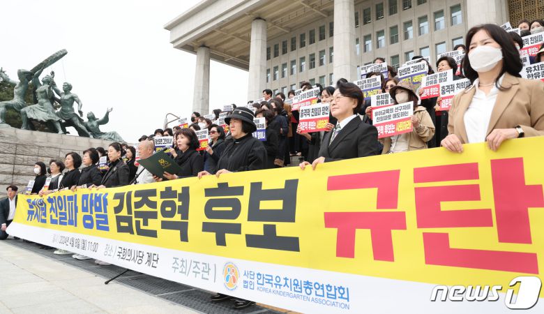 한국유치원총연합회(한유총) 회원들이 8일 오전 서울 여의도 국회 본청 앞에서 기자회견을 열고 김준혁 더불어민주당 수원정 후보의 사퇴를 촉구하고 있다.2024.4.8/뉴스1 ⓒ News1 신웅수 기자 |
