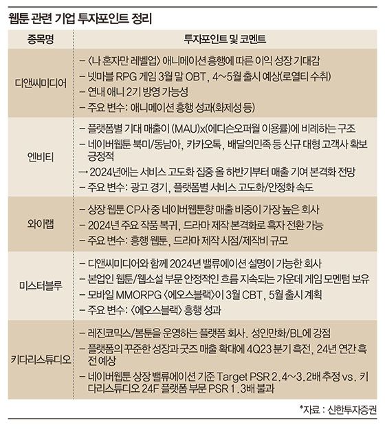 디앤씨미디어는 <나혼렙> 애니메이션이 일본과 북미에서 좋은 흐름을 이어가고 있어 웹툰 기업 중 유일하게 올해 성과를 이익으로 증명할 수 있을 것이란 분석이다. 연내 게임과 애니메이션 2기가 실적에 도움이 될 것이란 예상이다. 신한투자증권은 디앤씨미디어와 함께 미스터블루도 올해 밸류에이션이 기대되는 웹툰 종목이라고 꼽았다. 김아람 연구원은 “미스터블루는 본업인 웹툰, 웹소설 부문의 안정적 흐름과 게임 모멘텀도 보유했다”라며 “실제 모바일 MMORPG 에오스 블랙이 3월 CBT, 5월 출시 계획에 있다”라고 덧붙였다.