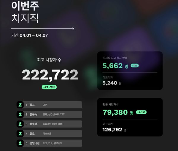 아울러 소프트콘 뷰어십에 따르면 지난주 치지직 평균 시청자 수는 약 7만9000여명을 기록했다. 같은 기간 아프리카TV의 평균 시청자 수 12만6000여명보다는 적었지만, 최고 동시 방송 수는 치지직이 5662명으로 아프리카TV보다 400명 이상 많았다.