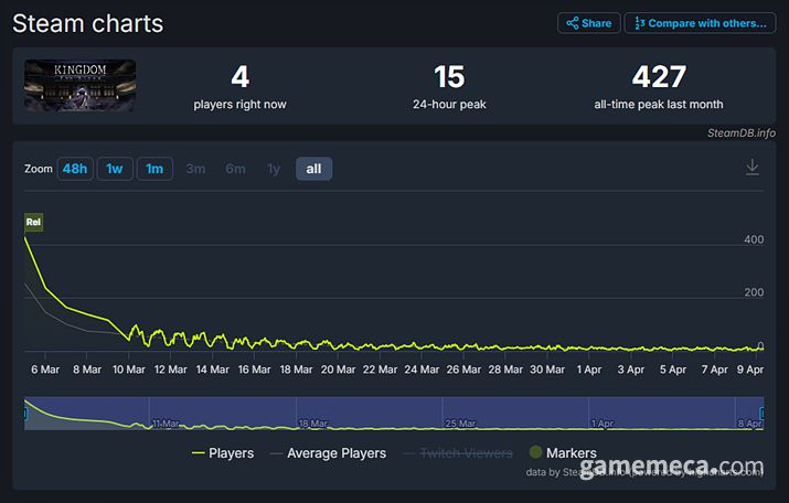 ▲ 해당 평가가 크게 부각되며 킹덤: 왕가의 피 스팀 접속자 수는 점차 감소했다 (자료출처: 스팀DB)