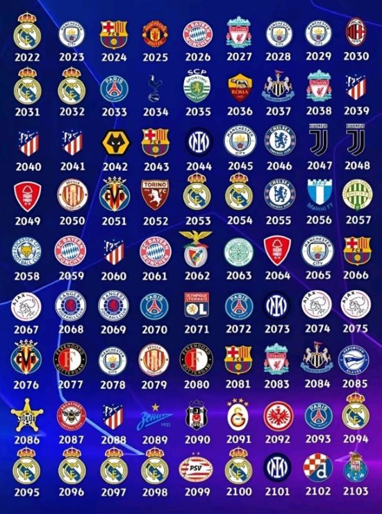 프리미어리그 팬들이 운영하는 'EPL 바이블'은 9일(한국시간) SNS를 통해 "AI(Artificial Intelligence)가 향후 80년간 챔피언스리그 우승할 팀을 예측했다"며 지난 두 시즌을 포함해 2103년까지 우승팀을 예측했다.