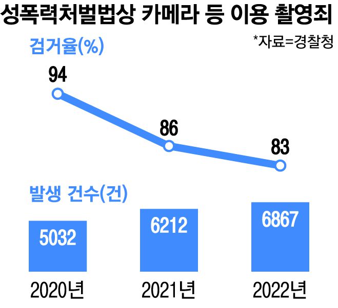 다른 사람 신체를 몰래 찍거나 그 촬영물을 유포하면 성폭력 범죄의 처벌 등에 관한 특례법상 5년 이하 징역 또는 1000만원 이하 벌금형에 처해질 수 있다. 그럼에도 몰카를 활용한 범죄는 최근 증가추세다. 9일 경찰청에 따르면 몰카 범죄 단속 건수는 2019년 5762건에서 2022년 6865건으로 3년새 19% 늘었다. 하지만 검거 건수는 같은 기간 5440건에서 5702건으로 늘어나는데 그쳐 검거율은 94.4%에서 83.1%까지 떨어졌다. 몰카 기기가 첨단화되면서 검거에 어려움을 겪고 있는 것이다.