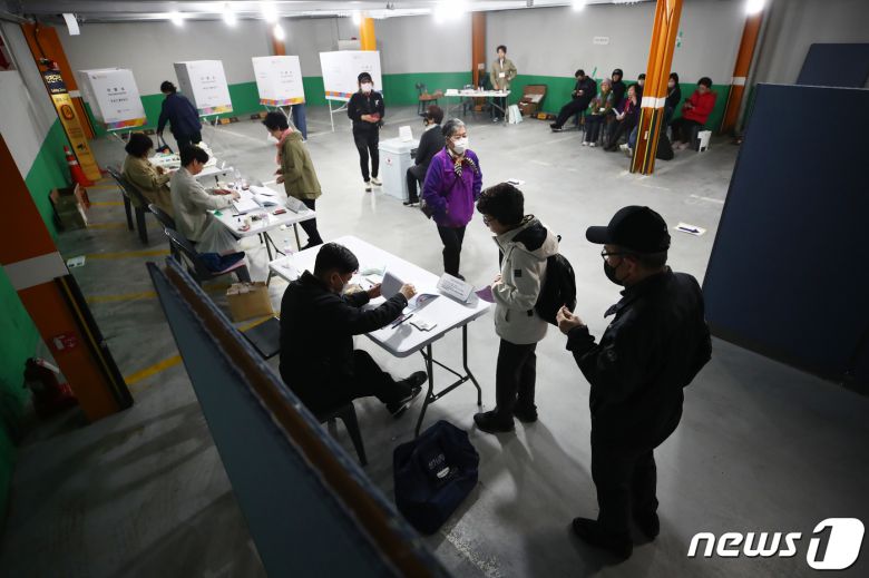 (서울=뉴스1) 이광호 기자 = 제22대 국회의원 선거일인 10일 오전 서울 마포구 공덕 1-2공영주차장에 마련된 공덕동 제4투표소를 찾은 유권자들이 소중한 한 표를 행사하고 있다. 2024.4.10/뉴스1