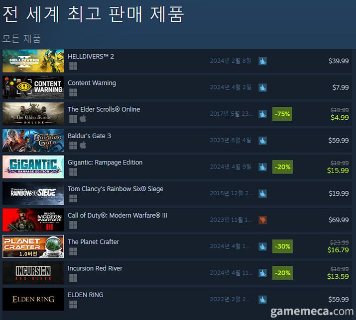 이외 스팀 전 세계 최고 판매 제품에서는 ‘헬다이버즈 2’와 ‘콘텐트 워닝’이 1, 2위를 유지했다. 목록에 새롭게 이름을 올린 게임으로는 2017년작 ‘기간틱’의 스팀 출시 버전이 5위를 기록했으며, 오랜 기간 앞서 해보기를 통해 유저 평가 ‘압도적으로 긍정적(96% 긍정)’을 받고있는 ‘플래닛 크래프터’가 8위에 올랐다.