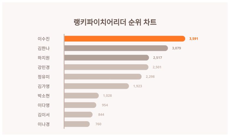 순위 키워드 4월 1주차 3월 4주차 증감 비율 1 이수진 3,591 3,231 360 11.1% 2 김한나 3,079 2,606 473 18.2% 3 하지원 2,517 1,766 751 42.5% 4 강민경 2,501 4,125 -1,624 -39.4% 5 정유미 2,298 2,717 -419 -15.4% 6 김가영 1,923 5,506 -3,583 -65.1% 7 박소현 1,028 1,076 -48 -4.5% 8 이다영 954 742 212 28.6% 9 김이서 844 811 33 4.1% 10 이나경 760 686 74 10.8% [출처: 랭키파이 인물 치어리더 트렌드 테이블]