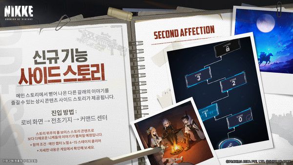 '승리의 여신: 니케'는 지난 11일 신규 인게임 콘텐츠인 '사이드 스토리'를 오픈하고, 첫 번째 이야기인 '세컨드 어펙션'을 공개했다. 사이드 스토리는 올해 초 공개된 개발자 영상에서 '스페셜 스토리(가칭)'로 언급됐으며 높은 중요도의 시나리오를 다루기 위해 메인 스토리에서 파생된 스토리 확장 콘텐츠다. 풀 보이스 스토리로 진행돼 높은 몰입도를 갖추고 있다.